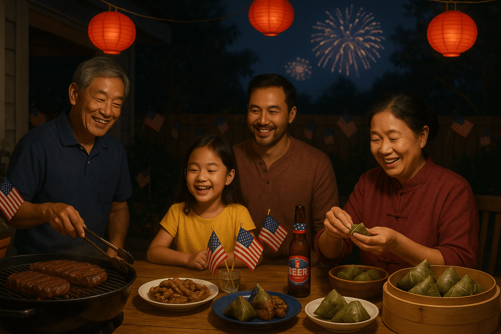 每年七月四日,家里的后院总会飘出一股奇特的混合味——炭火上的牛排香和蒸锅里八宝粽的糯米甜。这是我们家的国庆节,一半是汉堡和爆米花,一半是咸蛋黄和莲蓉馅。