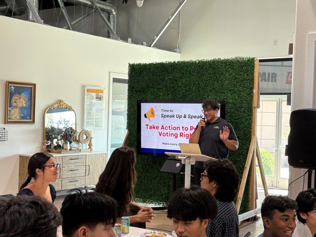 青年社区组织者 Nelson Chen 担任主持人。他在带领青年完成寻宝任务的同时,提醒大家关注正在德州发生的选区重划之战。Chen 指出,由党派推动的中期选区重划可能扭曲代表性并削弱民主。他对青年说:“这不仅是德州的问题。如果民主在德州被破坏,全国都会受到影响。我们必须站出来。”
