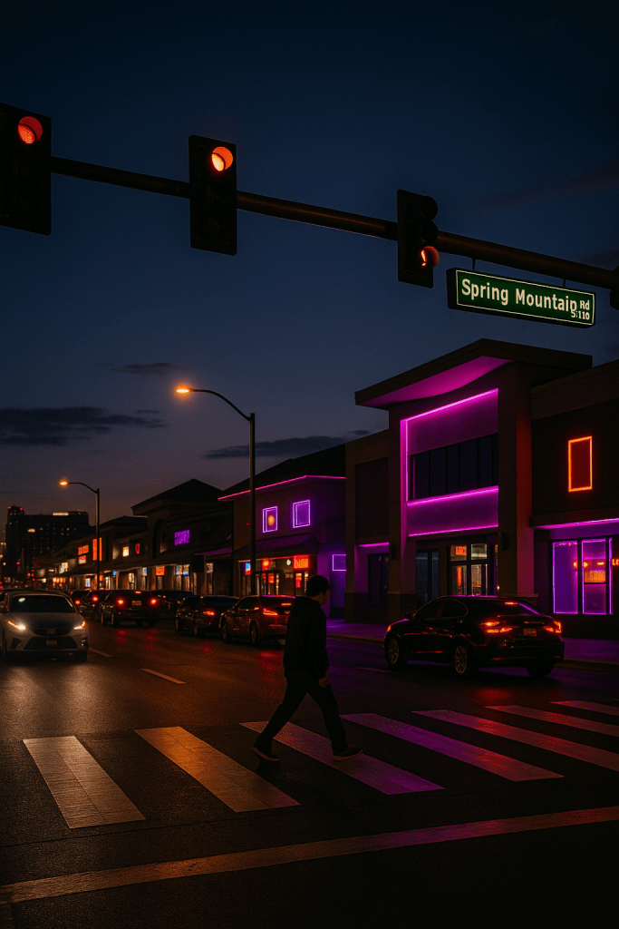 夜幕降臨後,春山路依舊明亮。餐館外聚集的客人、穿梭的車陣與從商場透出的霓虹,使這條走廊成為拉斯維加斯最具活力的街區之一。然而,在喧鬧的背後,居民與商家最常提起的,不是生意、也不是交通壅塞,而是——「走路其實不太安全。」